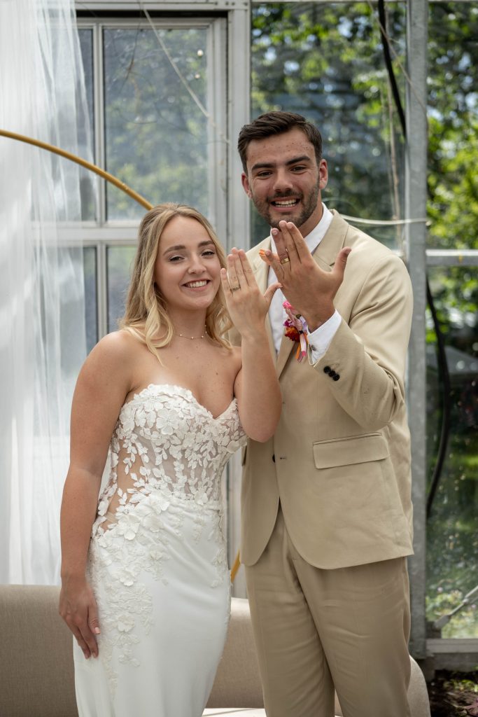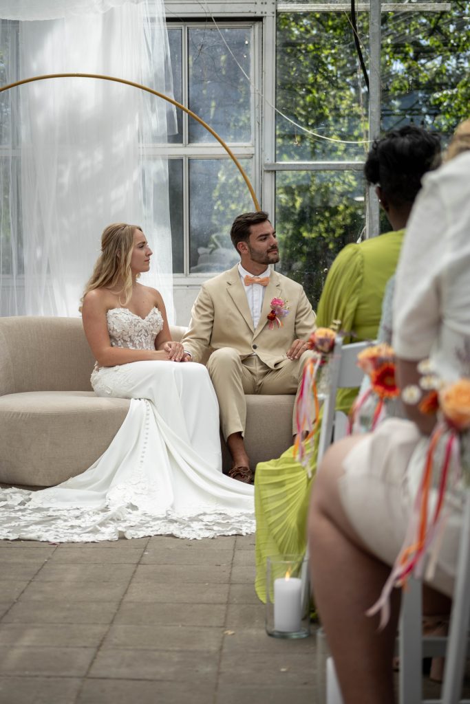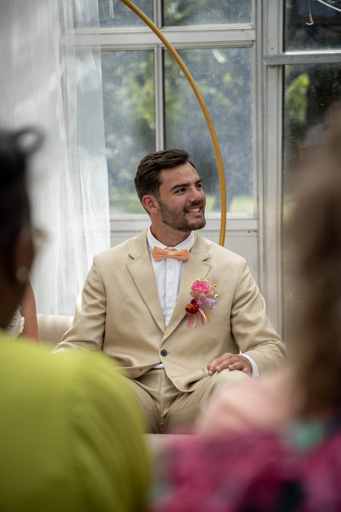De ceremonie vond plaats in de kas, midden tussen het groen. Door het mooie weer was het er flink warm, bijna tropisch, maar dat gaf het moment juist een extra sfeer. Omringd door familie en vrienden, met zonlicht dat door het glas naar binnen viel, spraken Dominique en Noa hun geloften uit. Een persoonlijk en emotioneel moment dat zichtbaar indruk maakte op iedereen die erbij was.