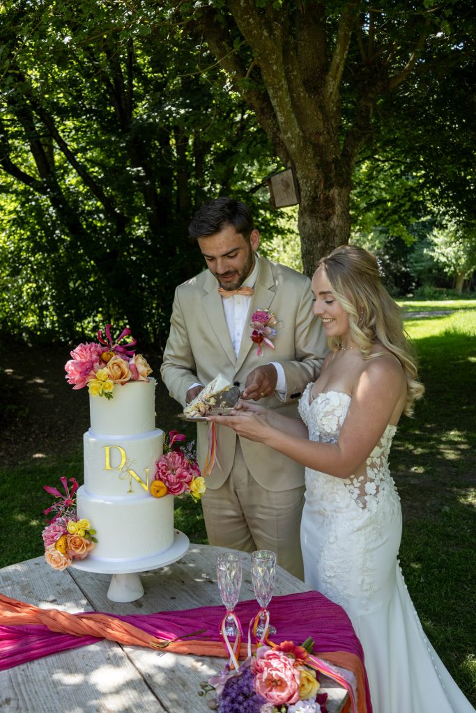 Ook het taart-aansnijmoment vond buiten plaats. In de zon, omringd door hun gasten, werd de taart aangesneden en niet veel later werd de champagne ontkurkt. Er werd gelachen, geproost en genoten van het moment, precies zoals een zomerse bruiloft hoort te zijn.