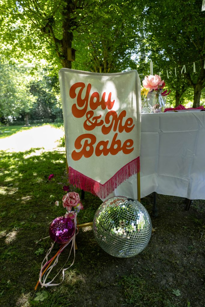Toen de avond viel, verplaatste het gezelschap zich opnieuw naar de tuin. Er werd gedineerd tussen de bomen, samen met familie en vrienden. Een lange tafel, sfeervolle decoratie en goede gesprekken zorgden voor een warme, intieme setting. Het buiten dineren vormde de perfecte afsluiting van een prachtige dag.