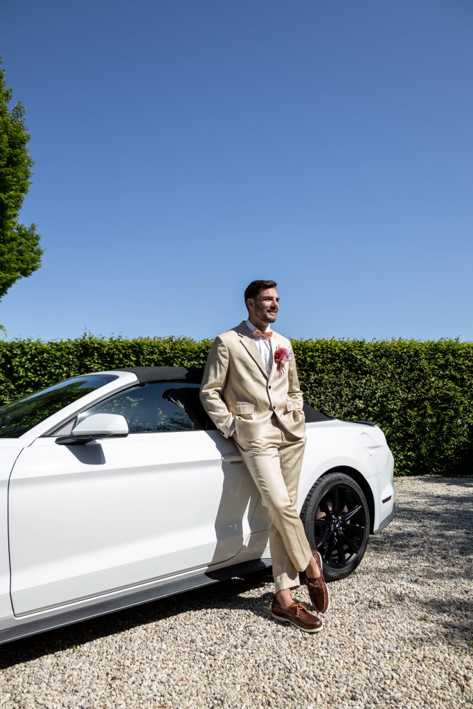 De dag begon meteen bijzonder met de aankomst van de bruidegom. Dominique arriveerde in een stoere Ford Mustang van JS Trouwauto’s, een echte eyecatcher die perfect paste bij de groene, open setting van ’t Struweel. Het geluid van de motor, de zon die weerspiegelde op de lak en de nieuwsgierige blikken van de gasten zorgden voor een energieke en feestelijke start.